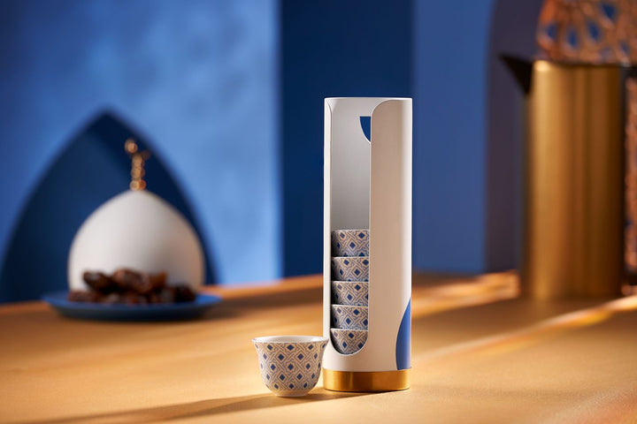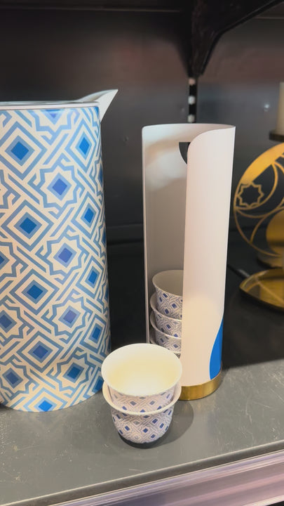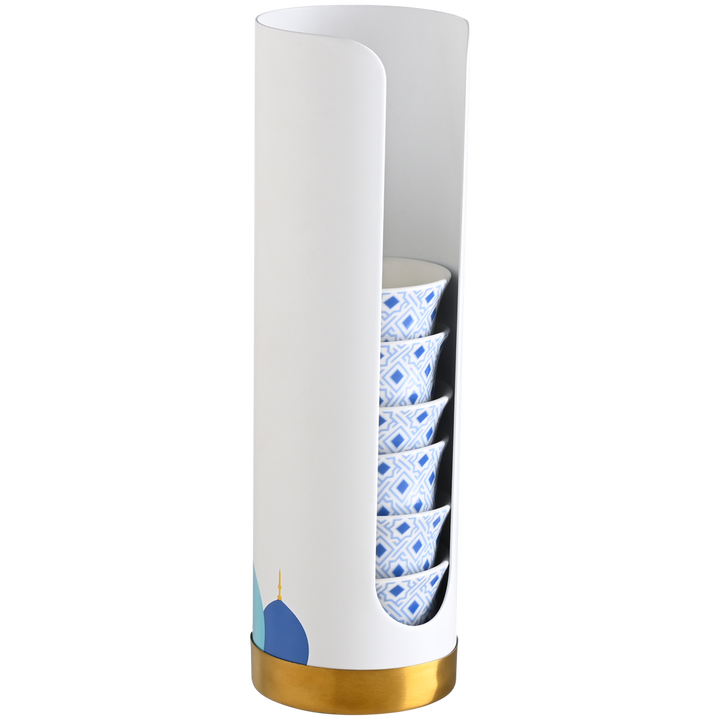 Blue & White Arabic Coffee Cup Set with Holder – 6 Persons