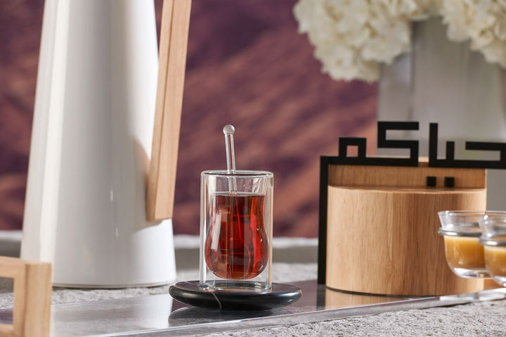 Elevate your tea time with the Elegant Glass Tea Set, a refined collection designed for 6 persons. This 12-piece set includes 6 transparent glass cups paired with 6 polished marble plates, combining modern elegance with natural charm. Perfect for serving tea, coffee, or herbal infusions, this set adds a sophisticated touch to your gatherings and impresses guests with its stylish presentation.