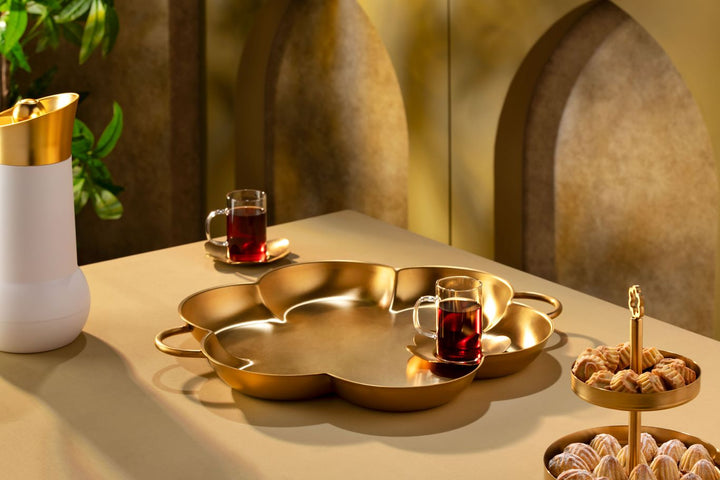 Add a touch of luxury to your gatherings with the Golden Bloom Serving Tray. Featuring an elegant floral design and a shimmering gold finish, this spacious tray is perfect for serving drinks, desserts, or snacks in style. Measuring 50×41.5×5 cm, it combines practicality with sophistication, making it a stunning centerpiece for both everyday use and special occasions.