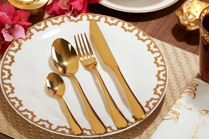 Elevate your dining experience with the Shiny Gold Stainless Steel Cutlery Set, a perfect blend of elegance and functionality. This 24-piece set includes knives, forks, spoons, and teaspoons, designed to serve 6 people in style. Crafted from high-quality stainless steel with a luxurious gold finish, each piece adds a sophisticated sparkle to your table setting. Ideal for daily use, festive occasions, or as a stunning gift, this cutlery set turns every meal into a special experience.