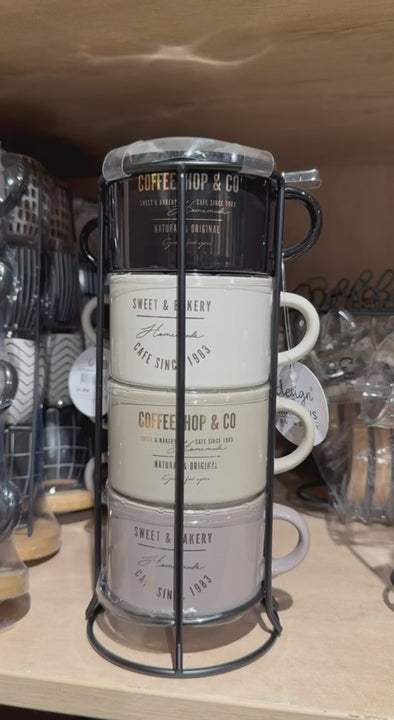 Stackable Ceramic Mug Set with Metal Stand – 4 Pieces